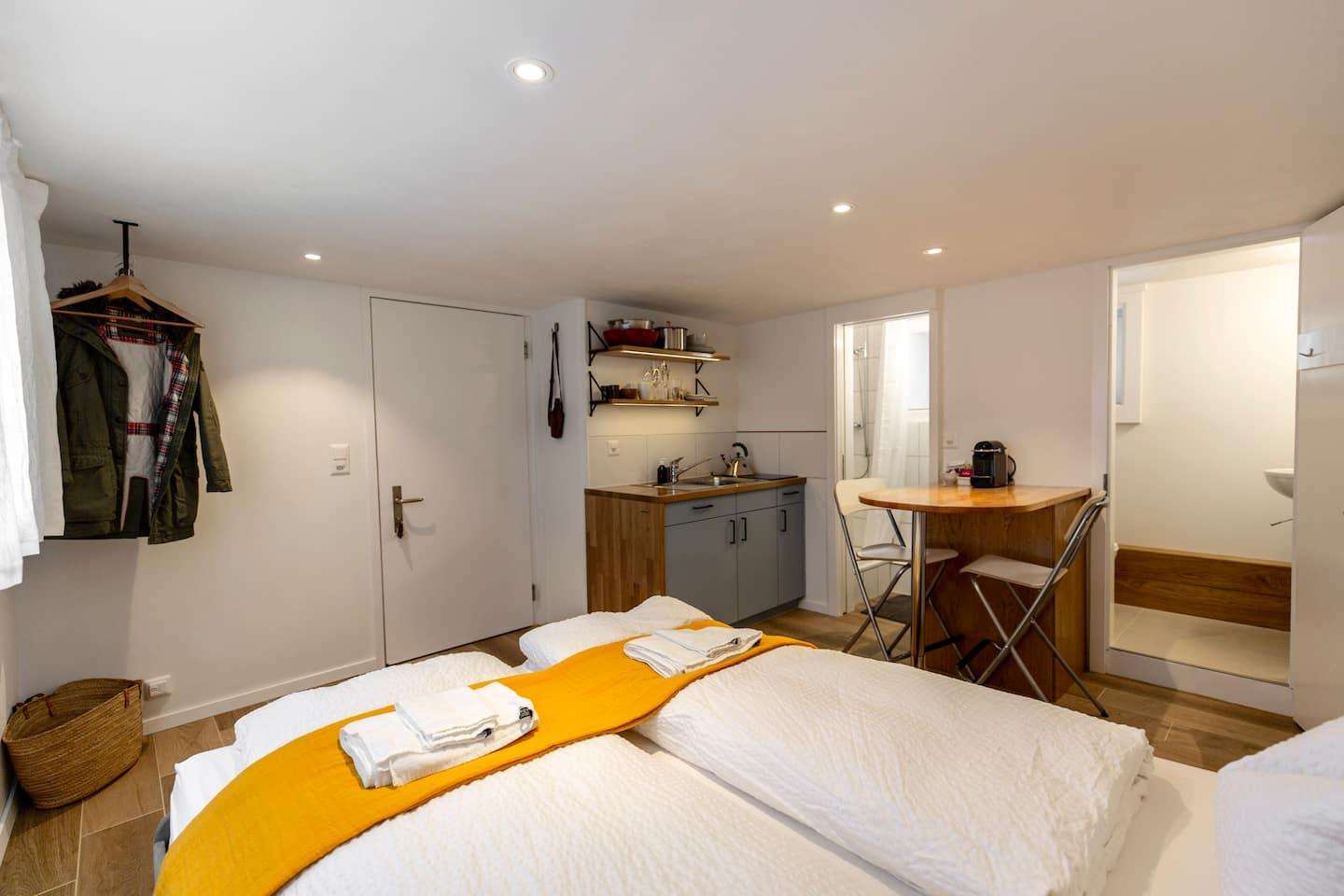 Moderner und supergemütlicher Raum mit Fußbodenheizung. Perfekt für zwei Gäste. Privater Eingang, Queensize-Bett (160 cm x 200 cm) mit zwei Bettwäsche- und Bettdeckensets, Küche, Esstisch und Stühlen, Badezimmer und Dusche. Die Küche ist mit einem kleinen Kühlschrank, einem Zwei-Flammen-Herd, Töpfen, Pfannen, Geschirr, einer Nespresso-Kaffeemaschine, Kaffeepads, Tee und einem Wasserkocher ausgestattet.