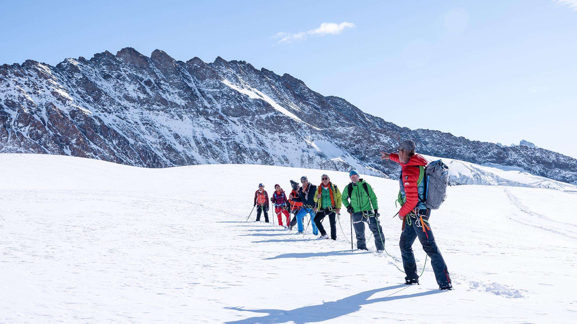 Für dieses einmalige Abenteuer holen wir euch am Treffpunkt ab und begleiten euch auf das auf 3'454 m ü. M. gelegene Jungfraujoch, der höchsten Bahnstation Europas. Angeseilt und ausgerüstet mit einem Klettergurt und einem Skistock führen euch unsere Bergführerinnen & Bergführer IVBV gekonnt über den Gletscher. Ihren Erfahrungsschatz und ihr Wissen über die Bergwelt im Allgemeinen und das Bergsteigen im Speziellen teilen sie jederzeit gerne mit euch. Die Gehdistanz und Gehgeschwindigkeit auf dem Gletscher können individuell an die Bedürfnisse eurer Gruppe angepasst werden. Nach einer Pause besucht ihr zusammen mit euren Begleitpersonen von OUTDOOR das imposante Bauwerk des Jungfraujochs. Ihr werdet beeindruckt sein von der weitläufigen Anlage, die mit viel Pioniergeist Ende des 19. Jahrhunderts geplant und in der Folge auf eindrückliche Art und Weise erbaut wurde.