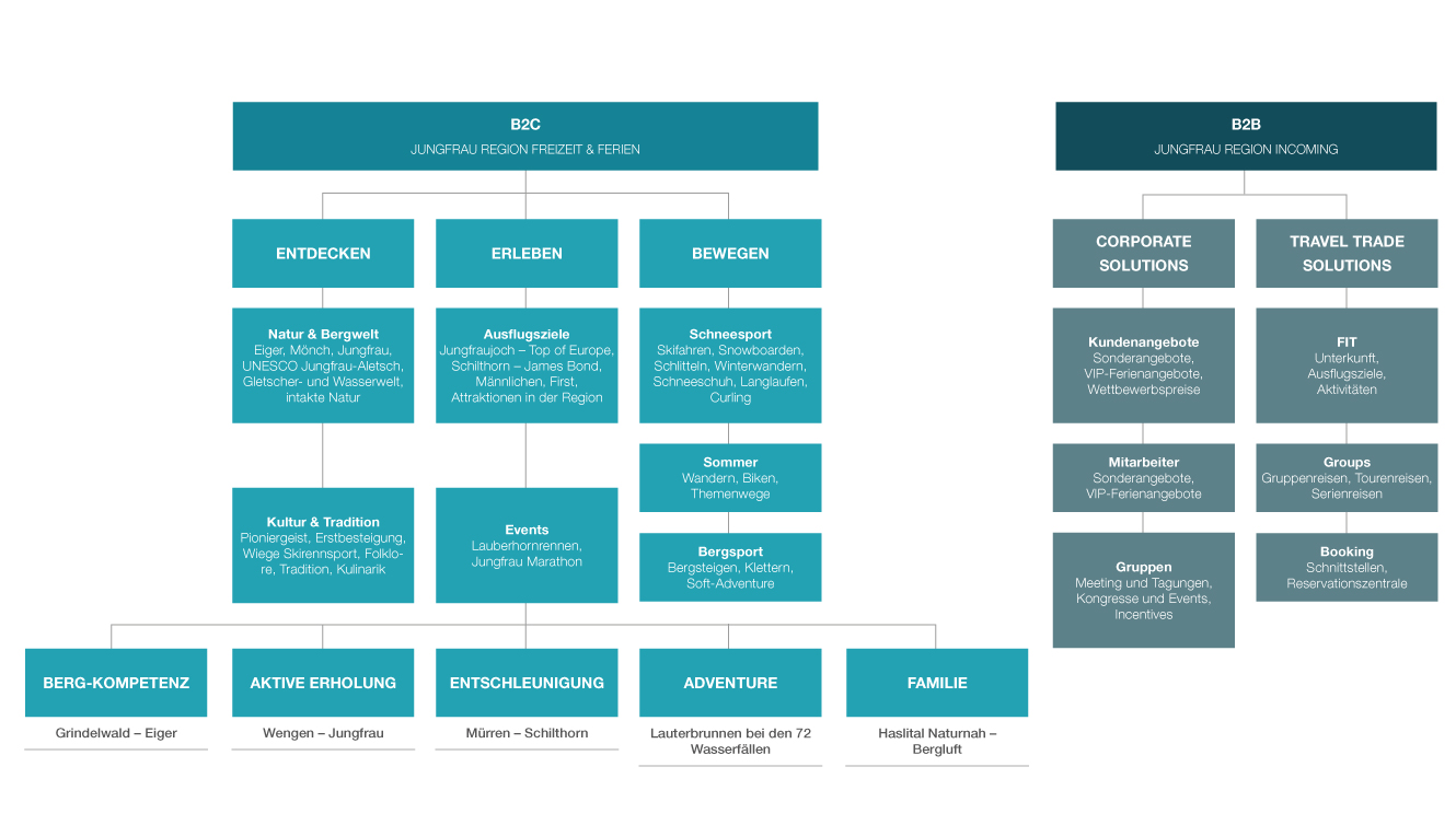 Die Geschäftsfelder und Themenwelten der Jungfrau Region ergeben sich aus den natürlichen Gegebenheiten und den erbauten Angeboten der Destination. Die Geschäftsfeldstruktur widerspiegelt die Strategie der DMO. Die Destination bewirtschaftet fünf Geschäftsfelder, welche in 13 Themenbereiche aufgegliedert sind. In erster Linie wird zwischen direkten (B2C) und indirekten Kunden (B2B) unterschieden. Innerhalb dieser Felder und Themen bewegen sich die fünf Marken als Ferienorte mit ihrer klar definierten Positionierung. Im B2C-Bereich werden drei Geschäftsfelder und sieben Themen bearbeitet. Im B2B-Bereich hingegen werden zwei Geschäftsfelder und sechs Themen angeboten. Unter Corporate Solutions sind Packages, welche die Jungfrau Region selber ausarbeitet, zu verstehen. Travel Trade Solutions hingegen beinhalten Packages, welche von Dritten inszeniert werden.