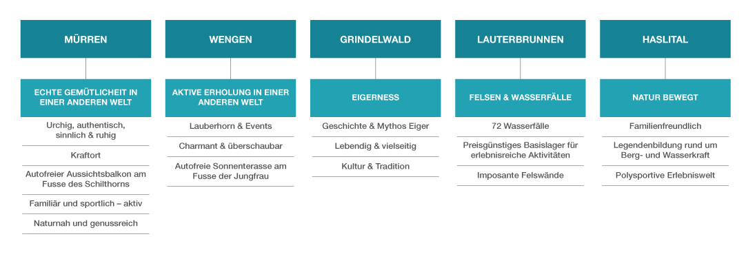 Gemäss der Multimarkenstrategie hat jeder Brand sowie die Jungfrau Region Tourismus AG eine eigene Positionierung, welche die Eigenschaften und Werte der entsprechenden Marke jeweils speziell hervorheben soll.