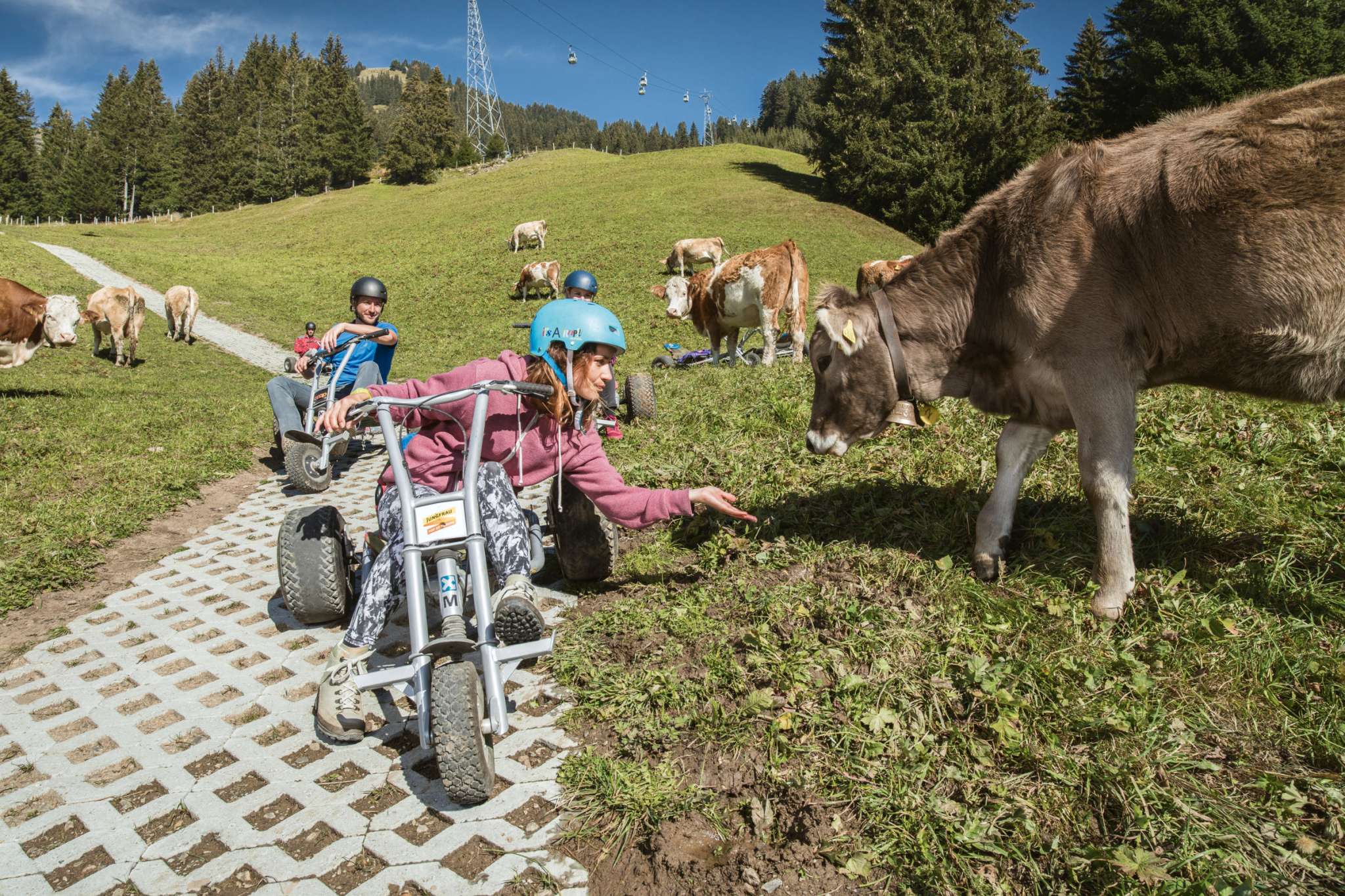 Le Mountain Cart, un mélange de kart et de luge, convient aux enfants mesurant au moins 135 cm. Des casques de protection sont mis gratuitement à disposition.