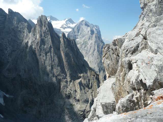 La vue sur la vallée sauvage d'Ochsen est magnifique. La descente se fait par plusieurs rappels et traces de sentier dans la vallée d'Ochsen. Tu peux reprendre des forces à la cabane Engelhorn avant de retourner au parking.