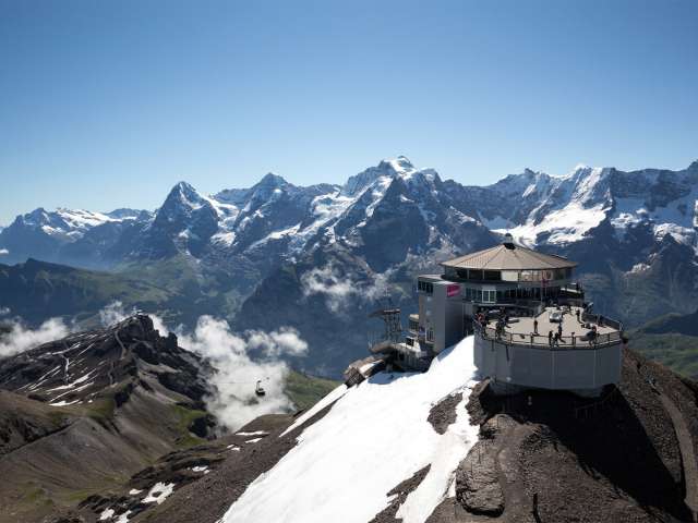 Profite de la vue à couper le souffle sur le patrimoine mondial de l'UNESCO avec l'Eiger, le Mönch, la Jungfrau et plus de 200 autres sommets dans le premier restaurant à 360° du monde, le Piz Gloria. Si les conditions de visibilité sont bonnes, tu peux même voir le massif du Mont-Blanc et la Forêt-Noire. Dans le restaurant 360°, tu dégusteras un délicieux déjeuner. Le Piz Gloria tourne une fois sur son axe en 45 minutes. Le bâtiment Piz Gloria se trouve au sommet du Schilthorn. Tout autour, il est entouré d'un terrain en pente. En hiver, c'est d'ici que part la piste de ski la plus haute, à environ 3000 m d'altitude. En été, le sommet est accessible par deux sentiers de randonnée. Mais ceux-ci ne sont souvent pas enneigés avant le début de l'été.